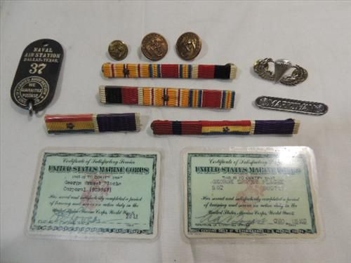 LOT 11 MILITARIANA WWII MARINE CORP PACIFIC CAMPAIGN SERVICE RIBBONS, 2 ACTIVE DUTY 1943 TO 1949 CARDS. AND MUCH MORE. AS SHOWN. VIEW PICTURE FOR DETAIL.