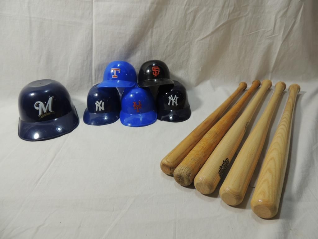 5 MINI LOUISVILLE SLUGGER BATS. 6 MINI HELMETS MILWAUKEE BREWERS, NEW YORK YANKEES. SAN FRANSICO. AS SHOWN. SEE PHOTO FOR MORE DETAILS.