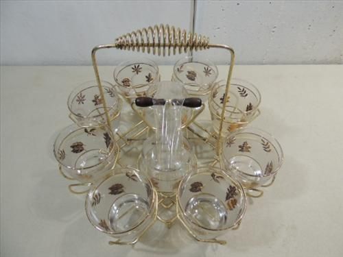 LOT 11 MID-CENTURY SALDON BARWARE 10 LIQUOR GLASES & SERVING OR HOLDER RACK. FROSTED GLASS & GOLD OAK LEAF. AS SHOWN. VIEW PICTURE FOR DETAIL.