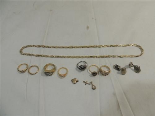LOT 11 VINTAGE 14K GF JEWELRY: NECKLACE, RINGS & PENDANTS. AS SHOWN. VIEW PICTURE FOR DETAIL.