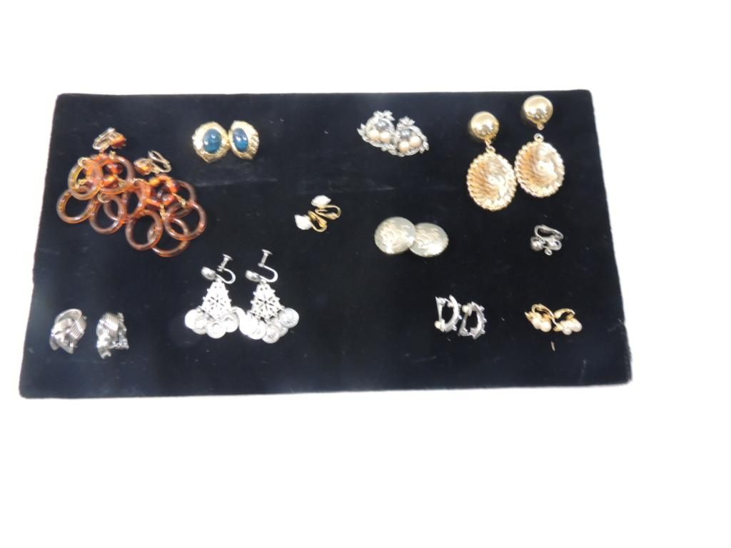 CLIP ON EARRINGS. ASSORTED VINTAGE EARRINGS. SILVERTONE, GOLDTONE, COSTUME JEWELRY. FASHION JEWELRY. AS SHOWN SEE PHOTO FOR MORE DETAILS.