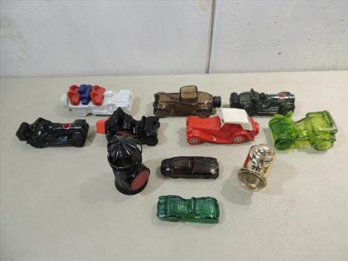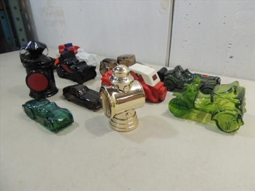 LOT 11 VINTAGE COLLECTOR AVON COLOGNE BOTTLES: CARS, LANTERNS.  AS SHOWN.  VIEW PICTURE FOR DETAIL.