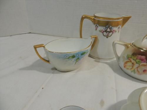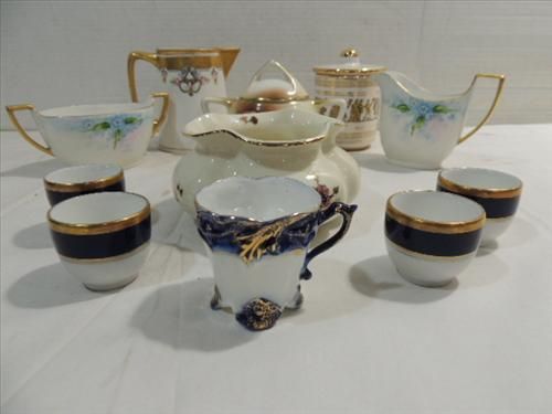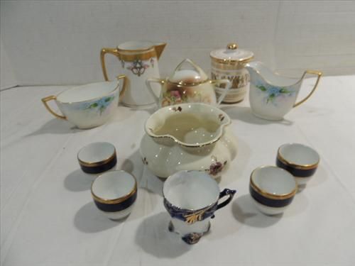 LOT 11 VINTAGE HUNGARIAN, PRUSSIAN CHINA: 4 EGG CUPS, SMALL PITCHER, SUGAR & CREAMER, AND MORE. AS SHOWN. VIEW PICTURE FOR DETAIL.