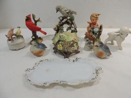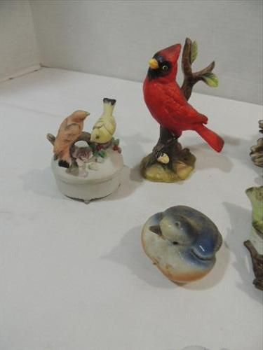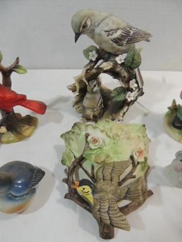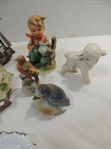 LOT 11 VINTAGE PORCELAIN FIGURINES: 7 ASSORTED BIRDS, ERICH STAUFFER S8517 BOY FIGURINE AND MORE. AS SHOWN. VIEW PICTURE FOR DETAIL.