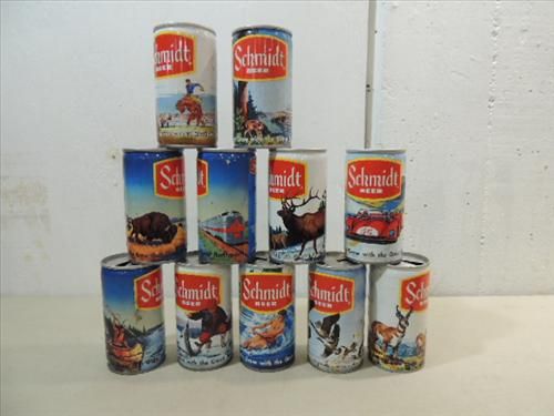 LOT 11 VINTAGE SCHMIDT ASSORTED SCENE BEER CANS. AS SHOWN.  VIEW PICTURE FOR DETAIL.
