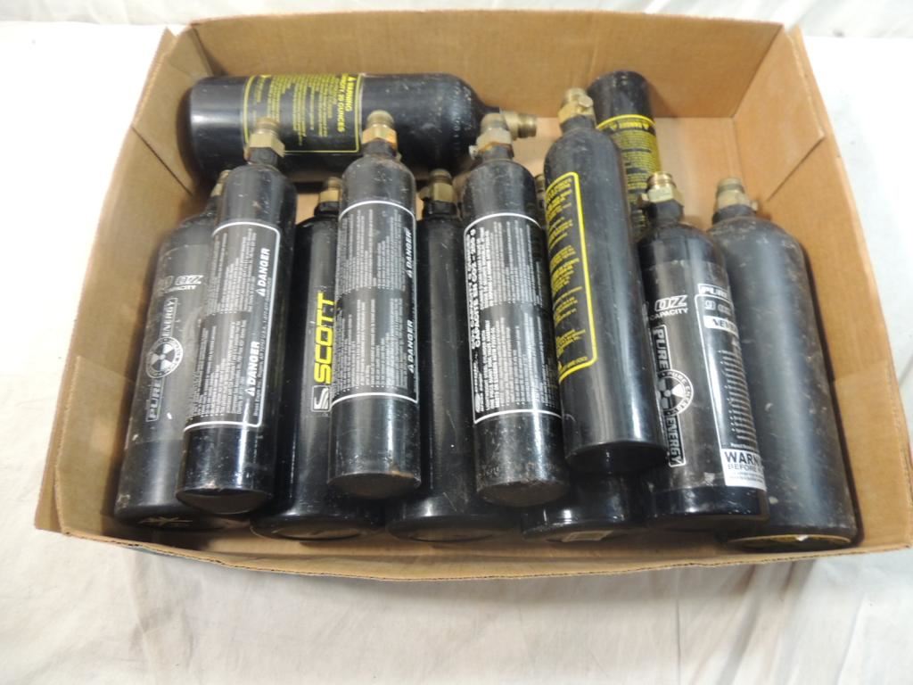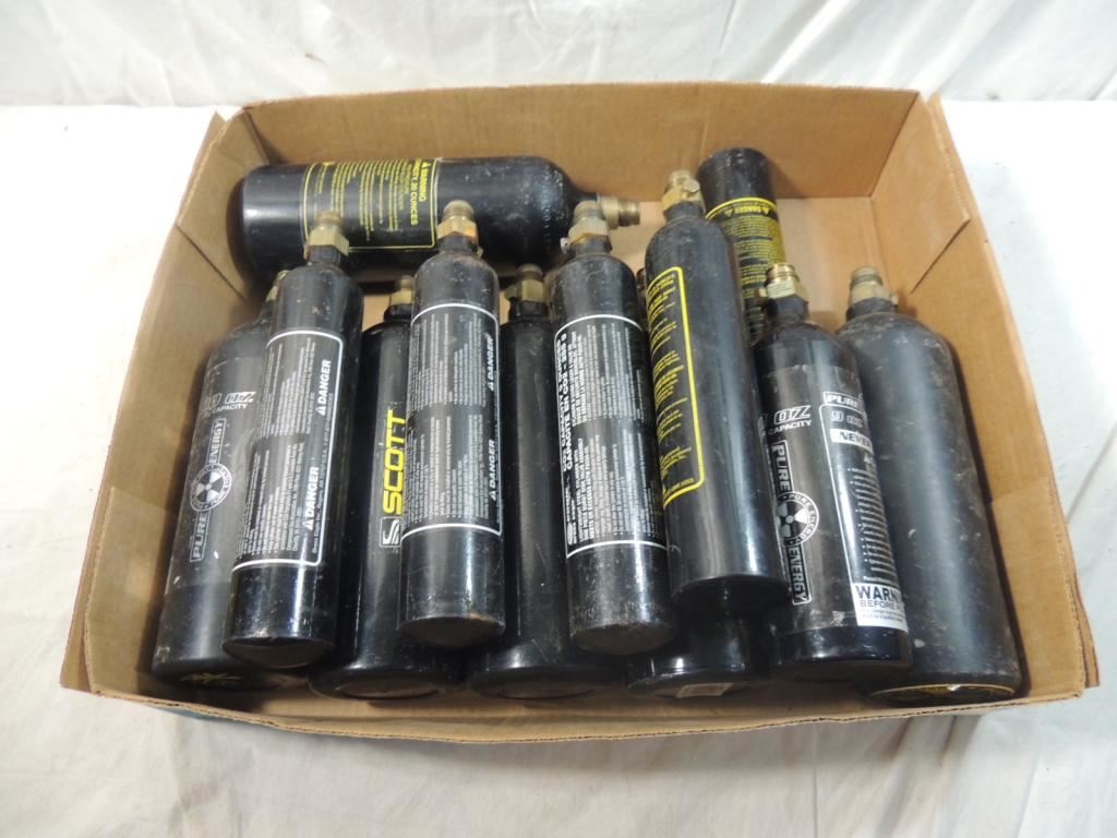 ASSORTED SIZES CO2 TANKS, CARTIRAGES, PAINTBALL, TOOLS, AS SHOWN SEE PHOTO FOR MORE DETAILS.
