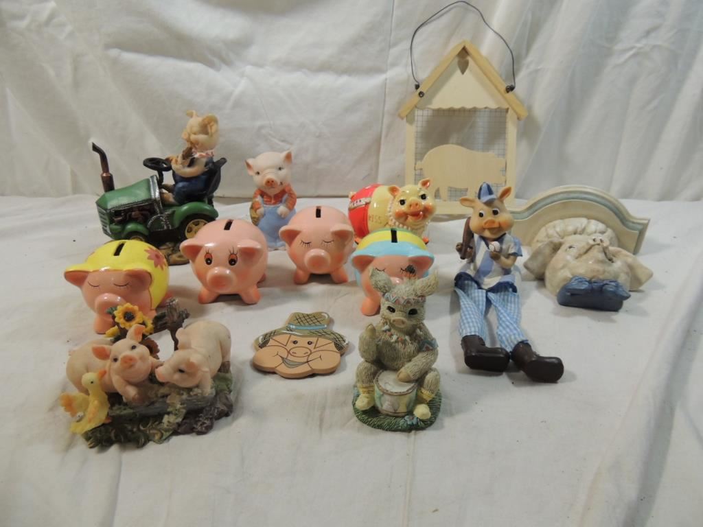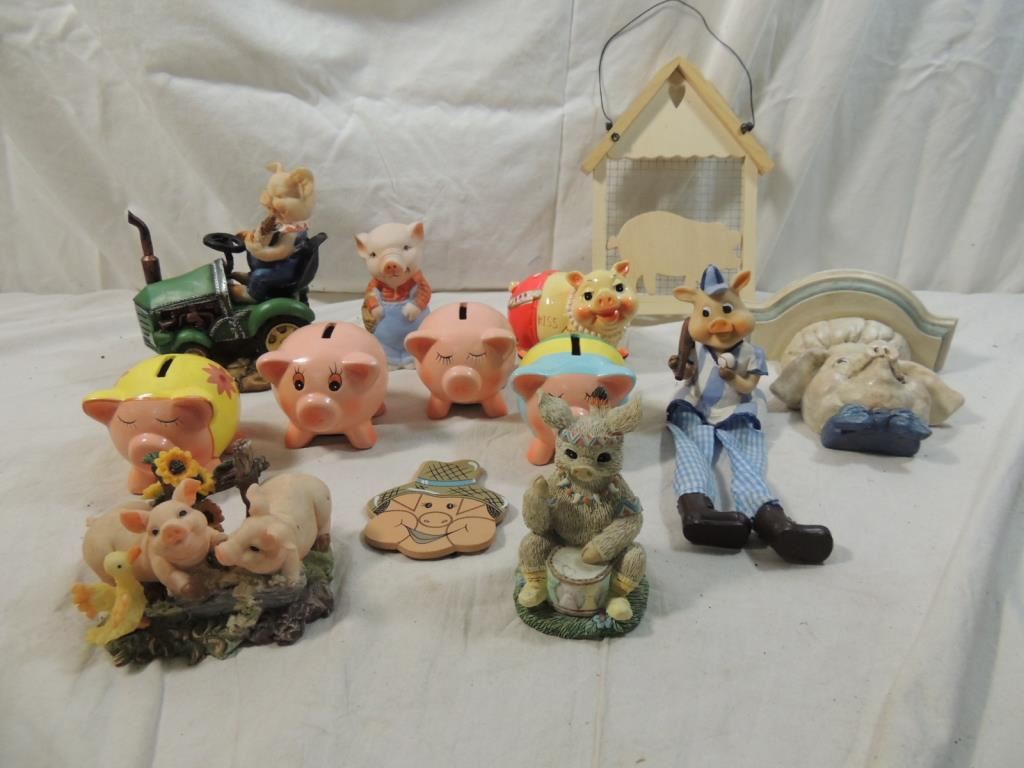 PIGGY BANKS, COLLECTIBLE FIGURES, FIGURINES, DECORIATVE PIG FIGURES AS SHOWN SEE PHOTO FOR MORE DETAILS.