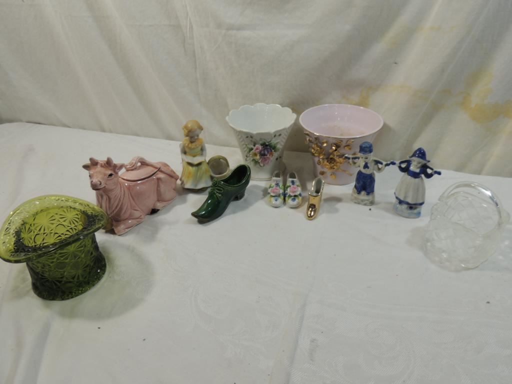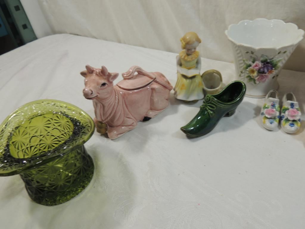 PORCELAIN SHOES, PLANTERS, COW SUGAR BOWL, GLASS PRESSED GLASS HAT, GLASS BASKET, AS SHWON SEE PHOTO FOR MORE DETAILS.