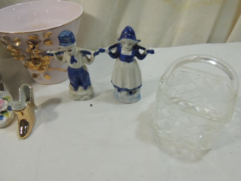 LEFTON & FENTON? PORCELAIN SHOES, PLANTERS, COW SUGAR BOWL, GLASS PRESSED GLASS HAT, GLASS BASKET, AS SHWON SEE PHOTO FOR MORE DETAILS.