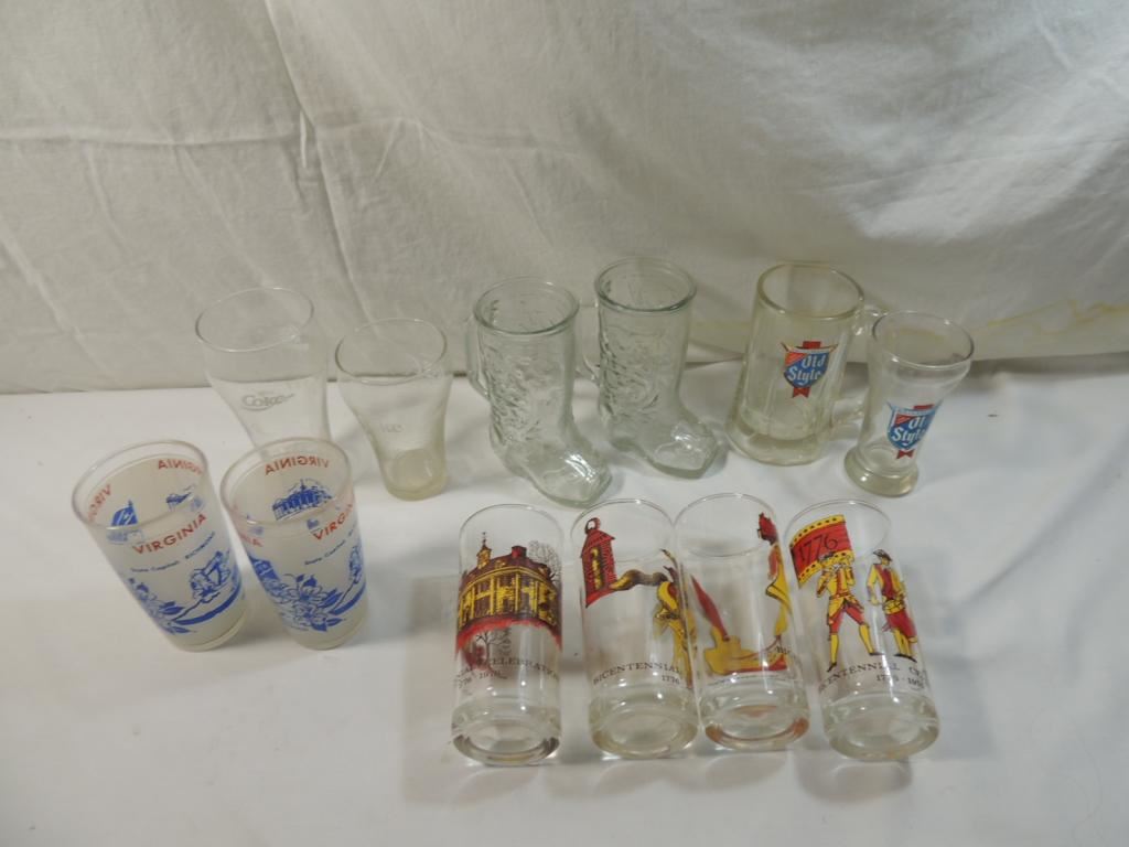 OLD STYLE HELLEMANS, VIRGINIA STATE GLASSES, CICENTENTIAL GLASSES, COCA COLA, BOOT GLASSES, AS SHOWN SEE PHOTO FOR MORE DETAILS.