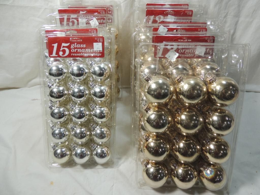 GLASS ORNAMENTS IN PACKAGE. GOLD AND SILVER CHRISTMAS ORNAMENTS. AS SHOWN. SEE PHOTO FOR MORE DETAILS