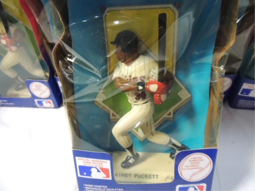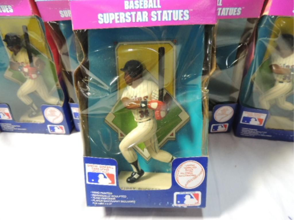 LOT 12 KIRBY PUCKETT BASEBALL PLAYER ACTION FIGURE STATUES. MADE IN THE USA. ROCKFORD, IL. IN BOXES. GREAT FOR BASEBALL THEME PARTY DECOR/ GIFTS. COLLECTIBLES. AS SHOWN. SEE PHOTO FOR MORE DETAILS.