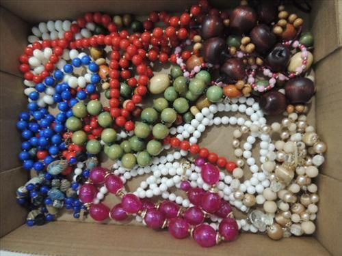 LOT 12 LADYS COSTUME JEEWLRY NECKLACES: GLASS, WOOD & PLASTIC BEADS. AS SHOWN. VIEW PICTURE FOR DETAIL.