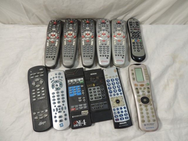 12 REMOTE CONTROLS, 6 ARE XFINITY REMOTE CONTROLS, AND 6 ARE UNIVERSAL REMOTE CONTROLS, AS SHOWN. ALL FOR ONE MONEY.