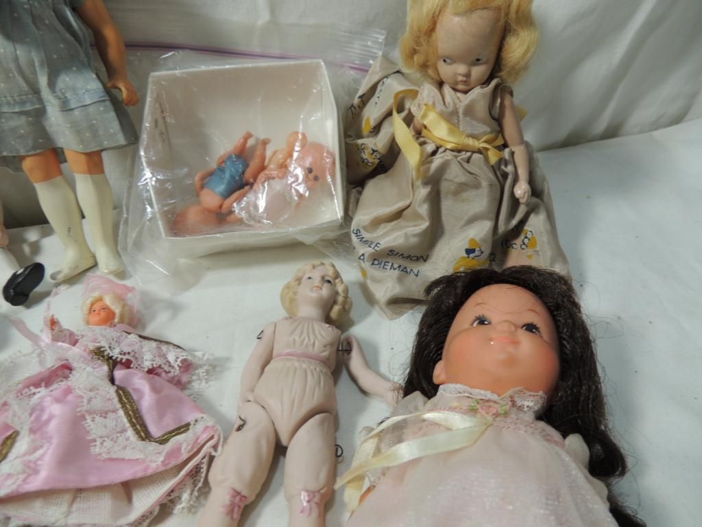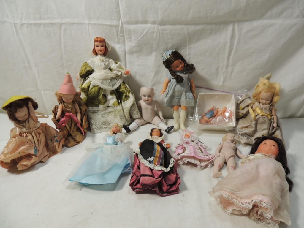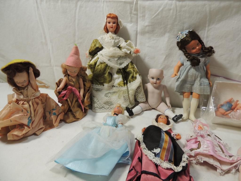 GINNY DOLL? VINTAGE SMALL PLASTIC PORCELAIN DOLLS. FULL BEAUTIFUL DRESSES. AS SHOWN. SEE PHOTO FOR MORE DETAILS