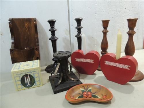 LOT 12 VINTAGE ASSORTED STYLE WOODEN CANDLE HOLDERS. AS SHOWN. VIEW PICTURE FOR DETAIL.