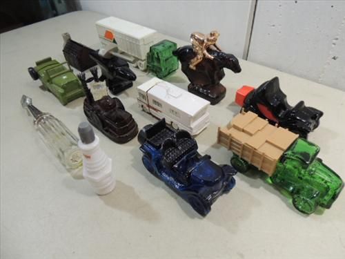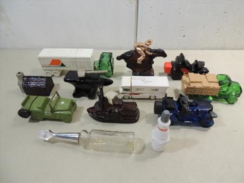 LOT 12 VINTAGE COLLECTOR AVON COLOGNE BOTTLES: CAR, TRUCK, SPARK PLUG, SCREW DRIVER AND MORE. AS SHOWN. VIEW PICTURE FOR DETAIL.