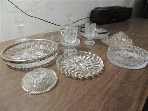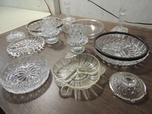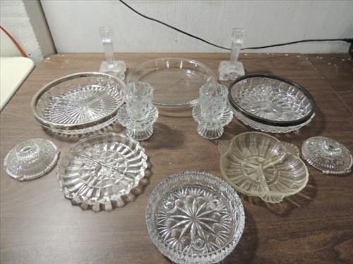 LOT 12 VINTAGE GLASSWARE: 4 DIVIDED TRAYS, 3 PAIR CANDLE HOLDERSAND 1 PIE DISH. AS SHOWN. VIEW PICTURE FOR DETAIL.