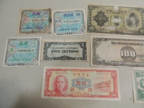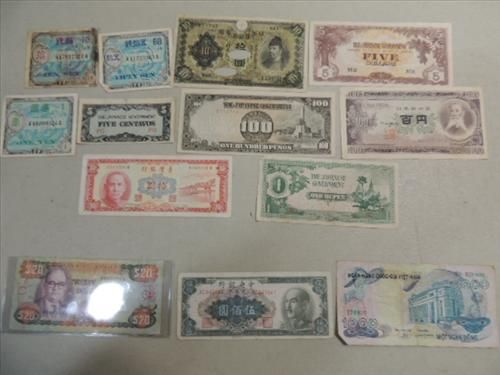 LOT 13 (10) JAPANESE WAR ISSUE BANK NOTES, 1 CHINESE PRE-COMMUNIST BANK NOTE, VIETNAM & JAMICAN NOTES. AS SHOWN. VIEW PICTURE FOR DETAIL.