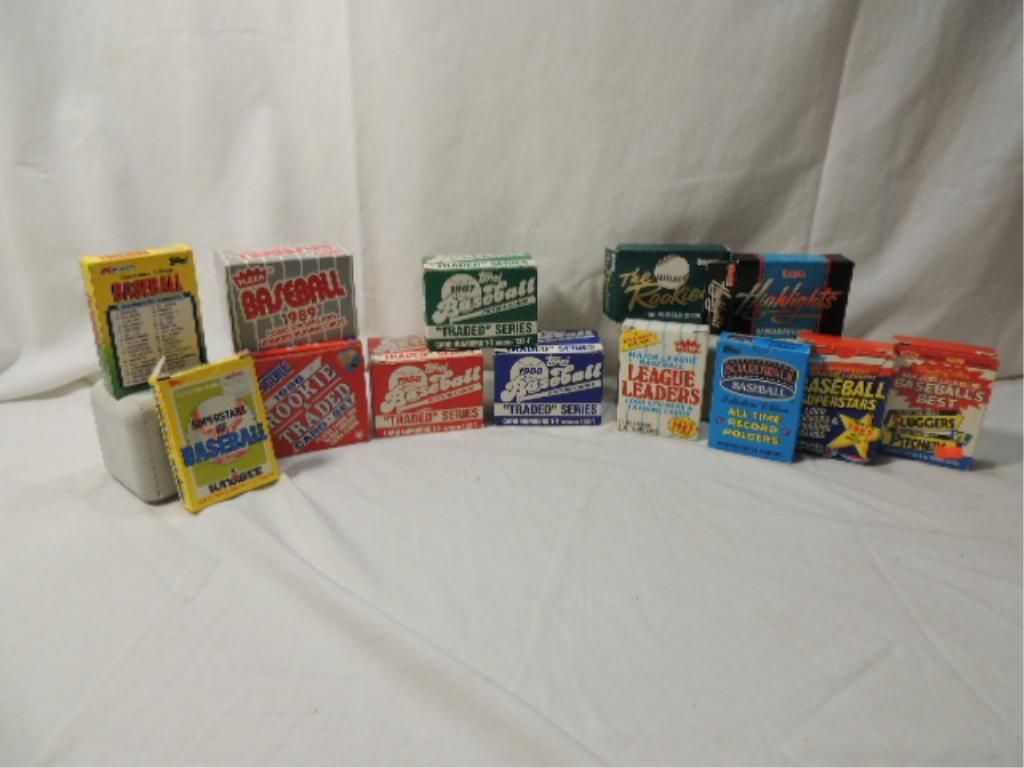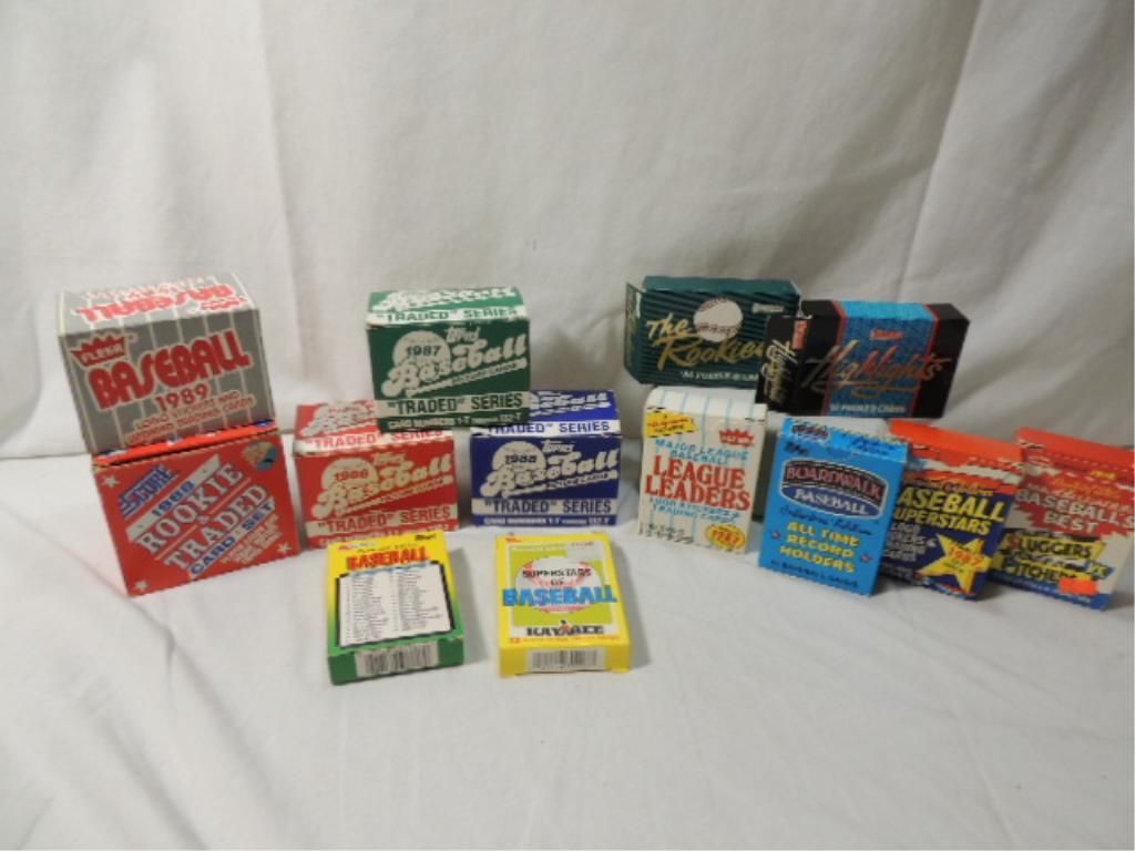 LOT 13 BASEBALL FACTORY SETS: 1986, 87, 88 TOPPS TRADED SERIES, 1989 SCORE UPDATE, 1988 SCORE ROOKIE & TRADED, TOPPS BOARDWALK BASEBALL, TOPPS KMART, DONRUSS ROOKIES, 1987 FLEER SUPERSTARS, 1986 SLUGGERS VS PITCHERS, DONRUSS HIGHLIGHTS, 1987 FLEER LEAGUE LEADERS. AS SHOWN SEE PHOTO FOR MORE DETAILS.