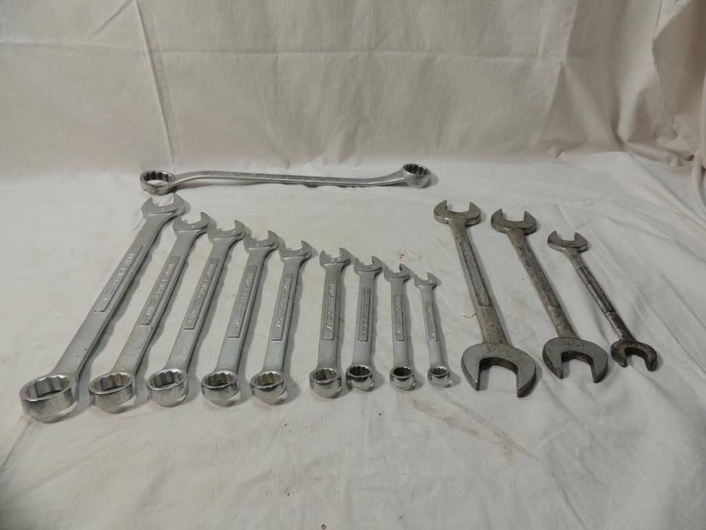 CRAFTSMAN WRENCHES. ASSORTED SIZES. 1 1/16, 7/8, 9/16, 1/2, 3/4, 15/16,1, 11/16 AND MORE. AS SHOWN. SEE PHOTO FOR MORE DETAILS.