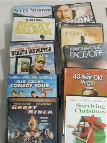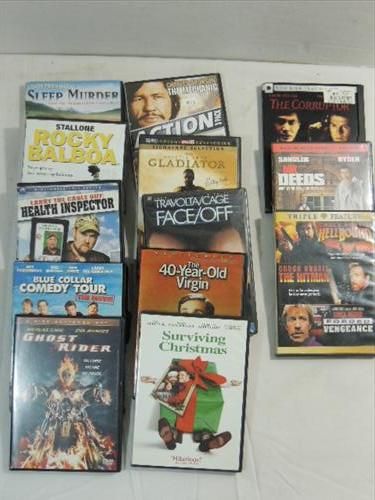 LOT 13 DVD MOVIE VIDEOS: FACE OFF, GLADIATOR, THE HITMAN, GHOST RIDER AND MORE. AS SHOWN. VIEW PICTURE FOR DETAIL.