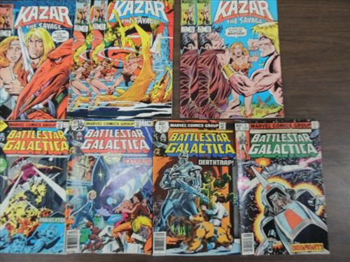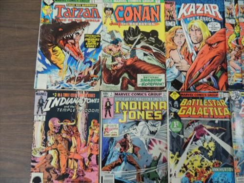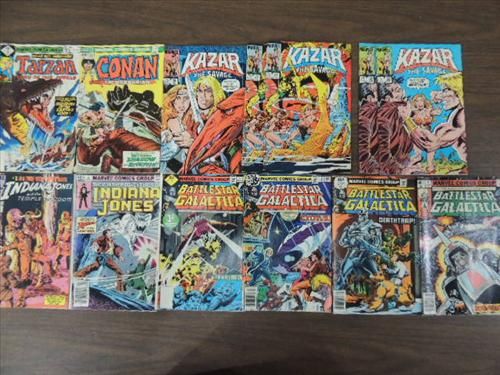 LOT 13 MARVEL COMIC SILVER AGE BOOKS: INDIANA JONES, BATTLESTAR GALATICA, TARZAN, KAZAR. AS SHOWN. VIEW PICTURE FOR DETAIL.