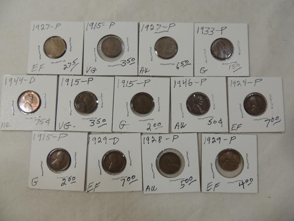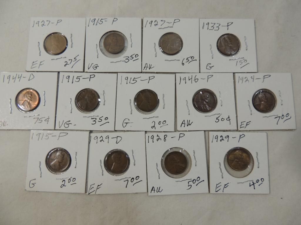 ASSORTED WHEAT PENNIES 1915, 1944, 1946, 1915, 1927, 1933, 1924, 1915, 1915, 1927, 1929, 1928, 1929 GOOD CONDITION. US CURRENCY COLLECTIBLE AS SHOWN SEE PHOTO FOR MORE DETAILS.
