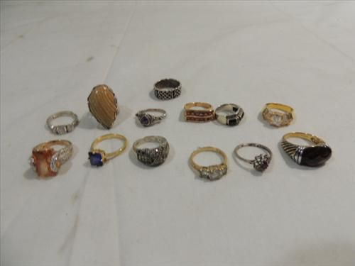 LOT 13 STERLING SILVER RINGS WITH VARIOUS STONES. THIS IS A VERY NICE SELECTION OF RINGS. AS SHOWN. VIEW PICTURE FOR DETAIL.