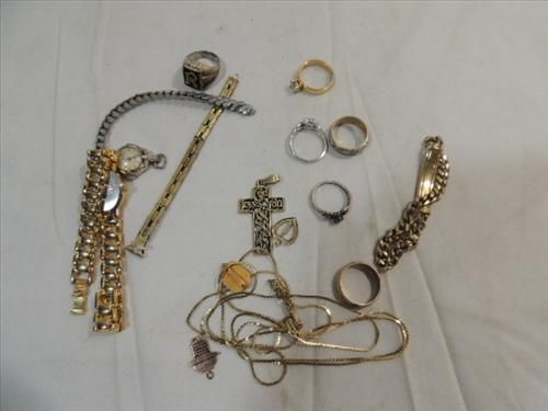 LOT 13 VINTAGE 10K GF (2) LADYS WRIST WATCHES, RINGS, & NECKLACES. AS SHOWN. VIEW PCTURE FOR DETAIL.