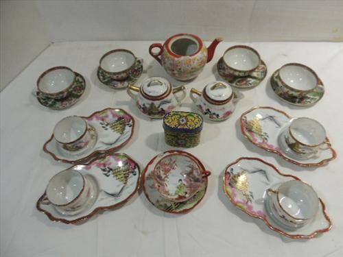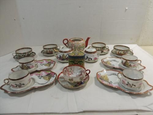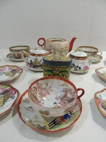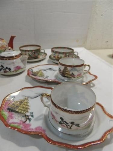 LOT 13 VINTAGE CHINA ORIENTAL TEA CUPS, TRAYS, TEA POT, CREAMER & SUGAR. AS SHOWN. VIEW PICTURE FOR DETAIL.