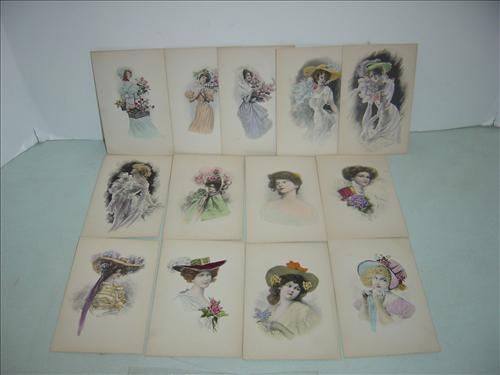 LOT OF 13 VINTAGE POSTCARDS. ALL ARE WATERCOLOR PRINTS OF WOMEN OR COUPLES. AS SHOWN. VIEW PICTURE FOR DETAIL.