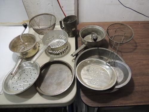 LOT 6 VINTAGE PRESSED METAL SIFTER, APPLE MASHER STRAINER, WIRE MESH STRAINERS, PRESSED METAL PIE TINS 8 TO 12"D. AS SHOWN. VIEW PICTURE FOR DETAIL.