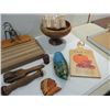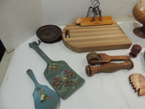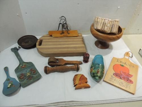 LOT 13 WOODEN COLLECTIBLES: CLOTHES PINS, DUTCH SHOE, CUTTING BOARD, DECORATIVE SPOONS, OLD PANT HANGERS AND MORE. AS SHOWN. VIEW PICTURE FOR DETAIL.