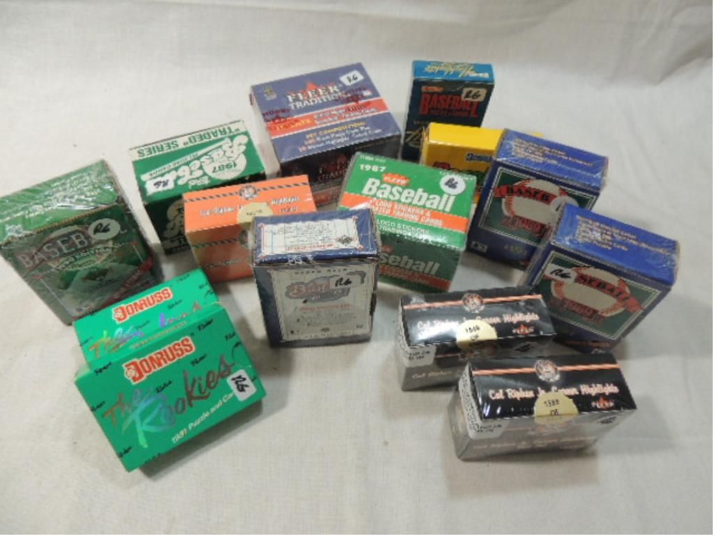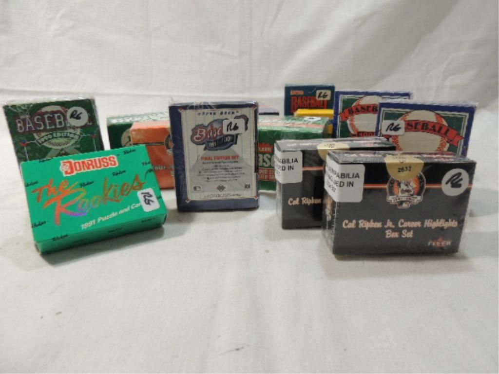 LOT 14 NEW BASEBALL PLAYER CARD SETS. MIXED MAKERS. TRADED SERIES, CAL RIPKEN JR CAREER HIGHLIGHTS SET, FINAL EDITION SET, ROOKIES. MORE. AS SHOWN SEE PHOTOS FOR DETAILS.