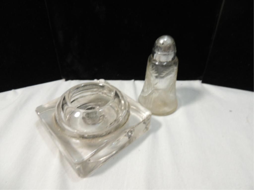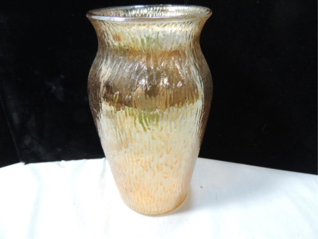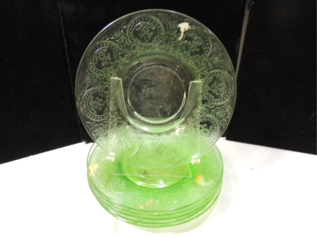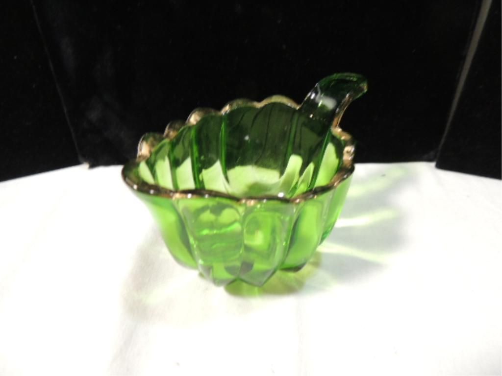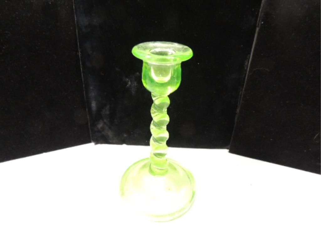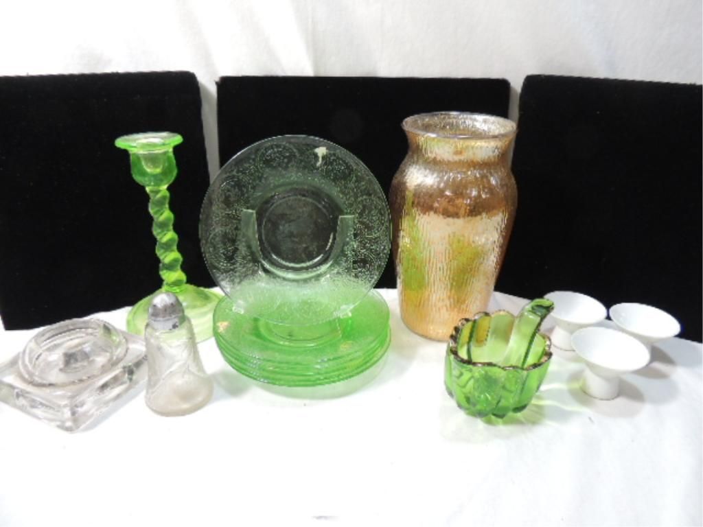 MIXED LOT. UNIQUE DEPRESSION VASELINE GLASS CANDLE STICK HOLDER AND PLATES. PEARLESCENT LUTERWARE CARNIVAL GLASS VASE. WHITE EGG CUPS, ETCHED GLASS SALT SHAKER, GOLD PAINTED LEAF BOWL. AS SHOWN SEE PHOTO FOR MORE DETAILS.