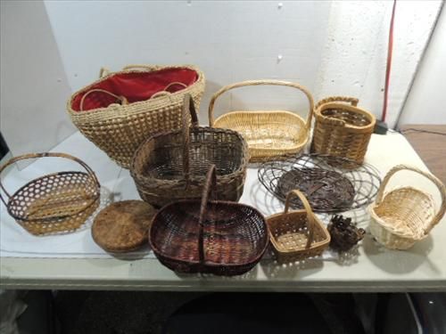 LOT 14 REED & WOOD WOVEN HAND BASKKETS. AS SHOWN. VIEW PICTURE FOR DETAIL.