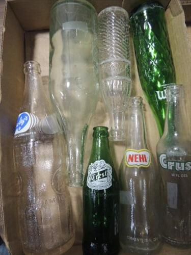 LOT 7 VINTAGE 10OZ TO 24 OZ SODA BOTTLES: NEHI, CRUSH, CREST, TEEM, ROCHELLE, BIRELEY'S, HAWES, KAYO, CREST, MORANDO, BIRELEY'S, BLACKHAWK AND MORE. AS SHOWN. VIEW PICTURE FOR DETAIL.