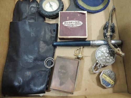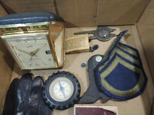 LOT 14 VINTAGE COLLECTIBLES: BRADLEY TRAVEL ALARM, TIRE COMPASS, LEAD DRAGON, SARGENT SHEFFRONS, COPPER PRINT BLOCK, LADY'S GLOVES AND MORE.  AS SHOWN. VIEW PICTURE FOR DETAIL.