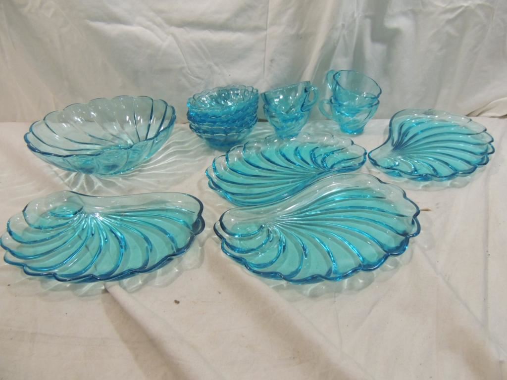 SWIRL BLUE GLASS, TEAL GLASS BLUE GLASS, DISH AND CUPS BOWL SMALL PLATES, DECORATIVE, VINTAGE GLASSWARE, AS SHOWN SEE PHOTO FOR MORE DETIALS.