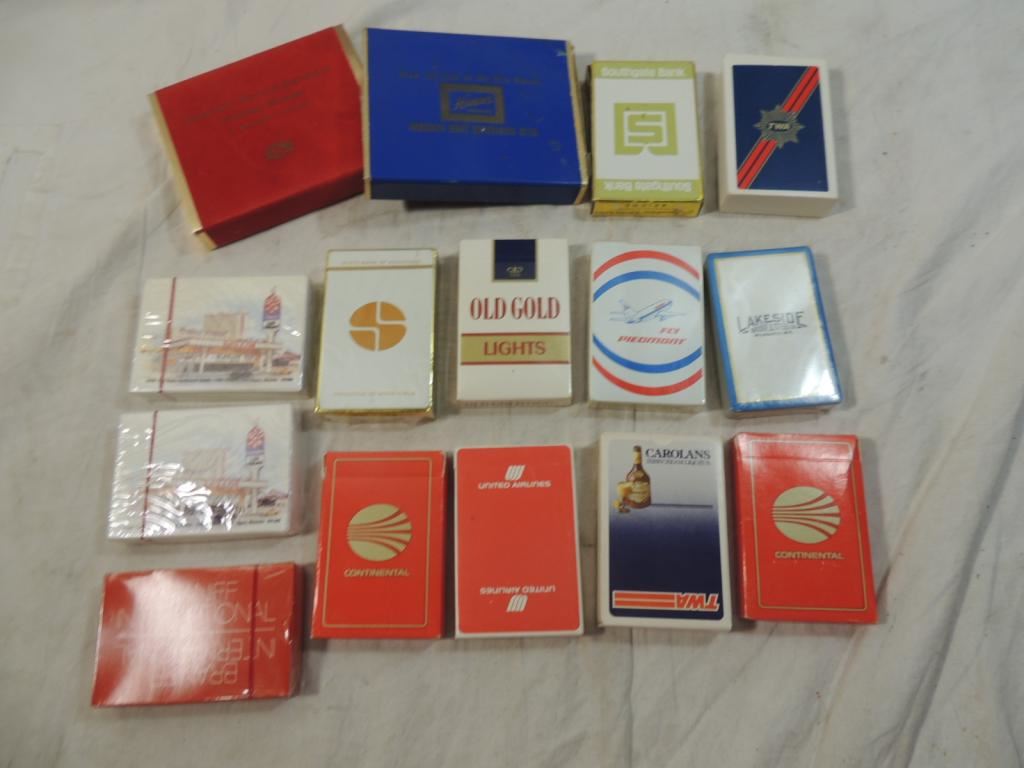 COLLECTIBLE PLAYING CARDS, ADVERSTISING CARDS, NEW CARDS, SOUTHGATE BANK, OLD GOLD LIGHTS, SLOTS A FUN CASINO, STATE BANK OF ROCKFORD, LAKESIDE BRIDGE & STEEL, FLY PIEDMONT, UNITED AIRLINES, CAROLANS, CONTINENTAL, BRANIFF INTERNATIONAL, TWA AS SHOWN SEE PHOTO FOR MORE DETIALS.