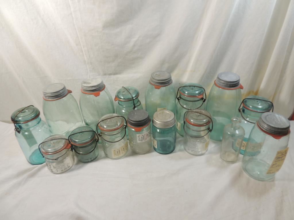 BALL MASON JARS, GALLON JARS, 1900-1910 ANTIQUE GLASS JARS, BALL JARS, BLUE GLASS JARS, MASON JARS, 1/2 PINT JARS, MASON JARS AS SHOWN SEE PHOTO FOR MORE DETAILS