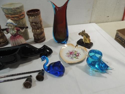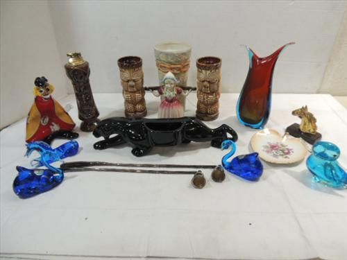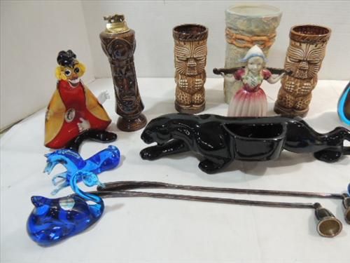 LOT 15 ASSORTED GLASS & CERAMIC COLLECTIBLES: 2 SILVER PLATED CANDLE SNUFFER, CERAMIC BLACK PANTHER, MURANO STYLE CLOWN, CERAMIC CHESS PIECE CIGARETTE LIGHTER AND MORE. AS SHOWN. VIEW PICTURE FOR DETAIL.