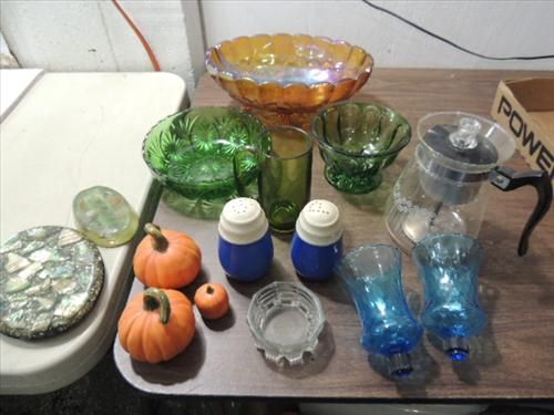 LOT 15 ASSORTED VINTAGE CERAMIC, GLASS COLLECTIBLES: 3 GREEN GLASS BOWLS & MUG, LARGE CARNIVAL GLASS BANANA BOAT, 3 CERAMIC PUMPKINS, SHAWNEE SALT & PEPPER SHAKERS AND MORE. AS SHOWN. VIEW PICTURE FOR DETAIL.