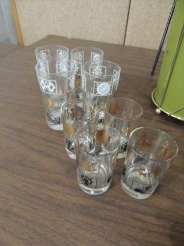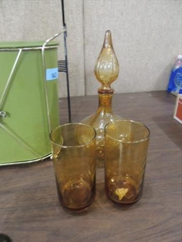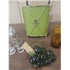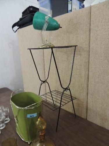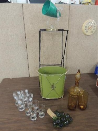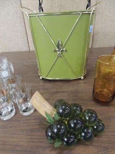 LOT 15 MID CENTURY MODERN COLLECTIBLES: METAL WIRE STYLIZED STAND, GLASS GRAPES, TRASH CAN, DIRECTIONAL LAMP & GLASSWARE. AS SHOWN. VIEW PICTURE FOR DETAIL.