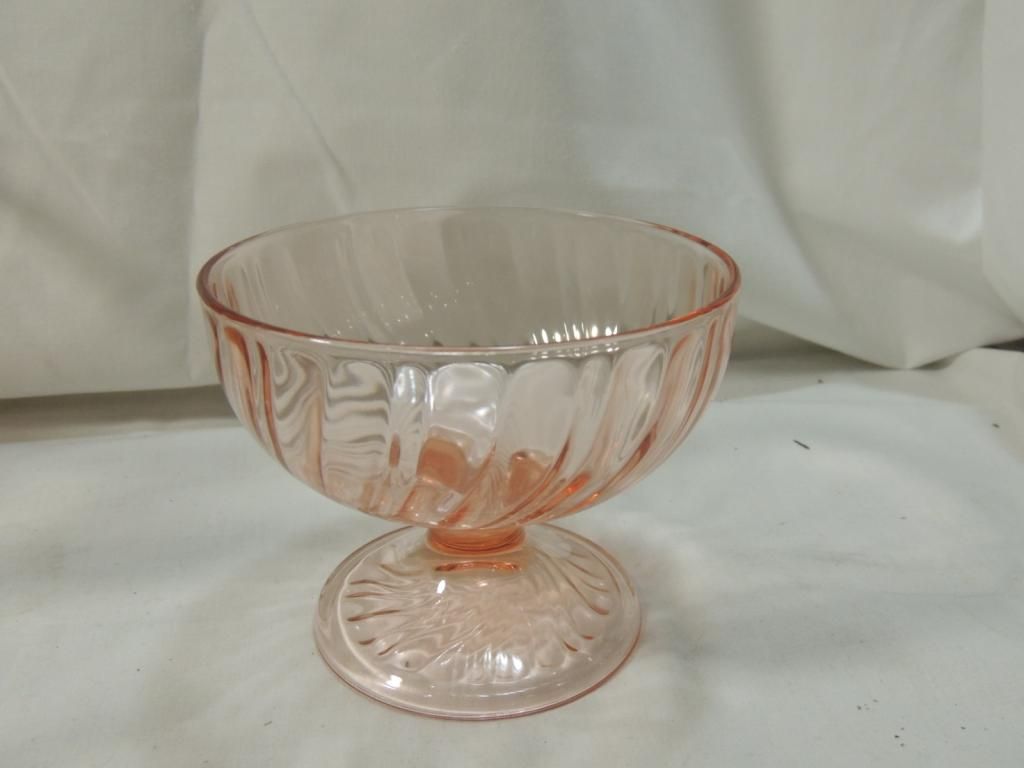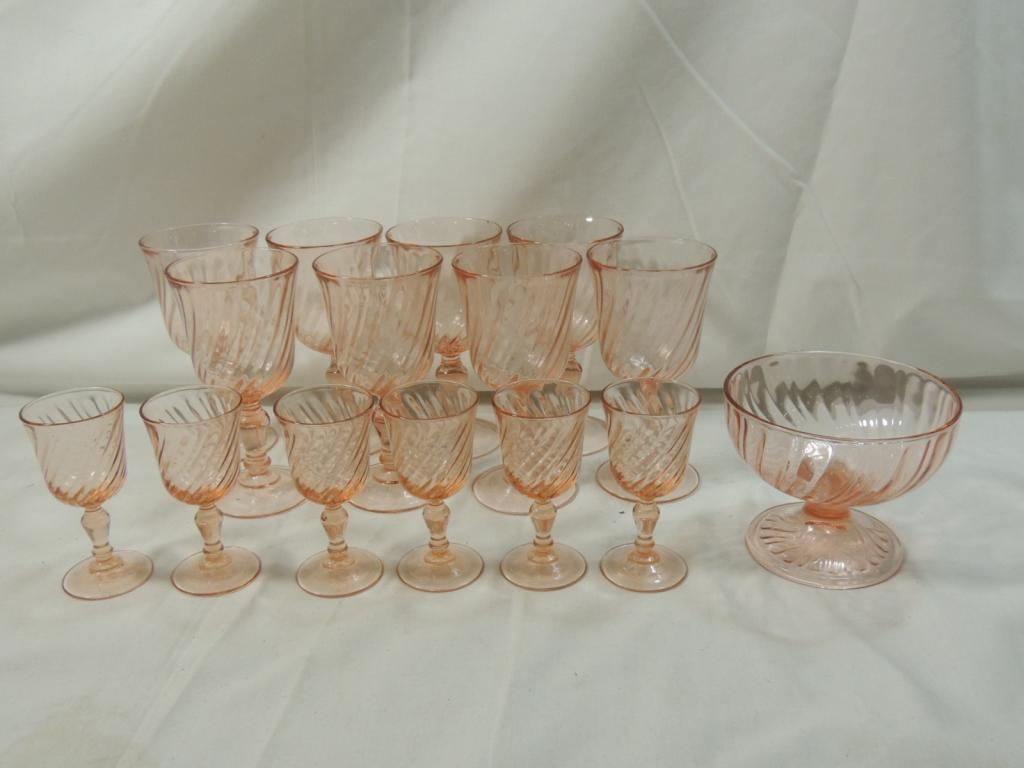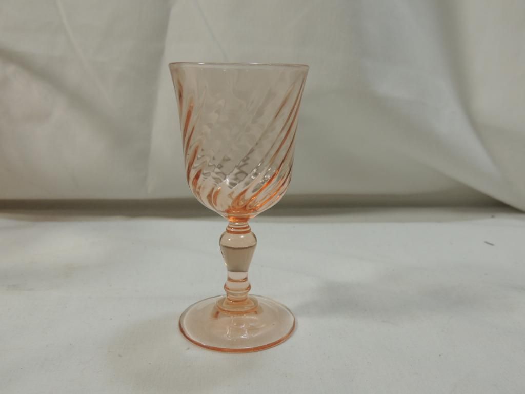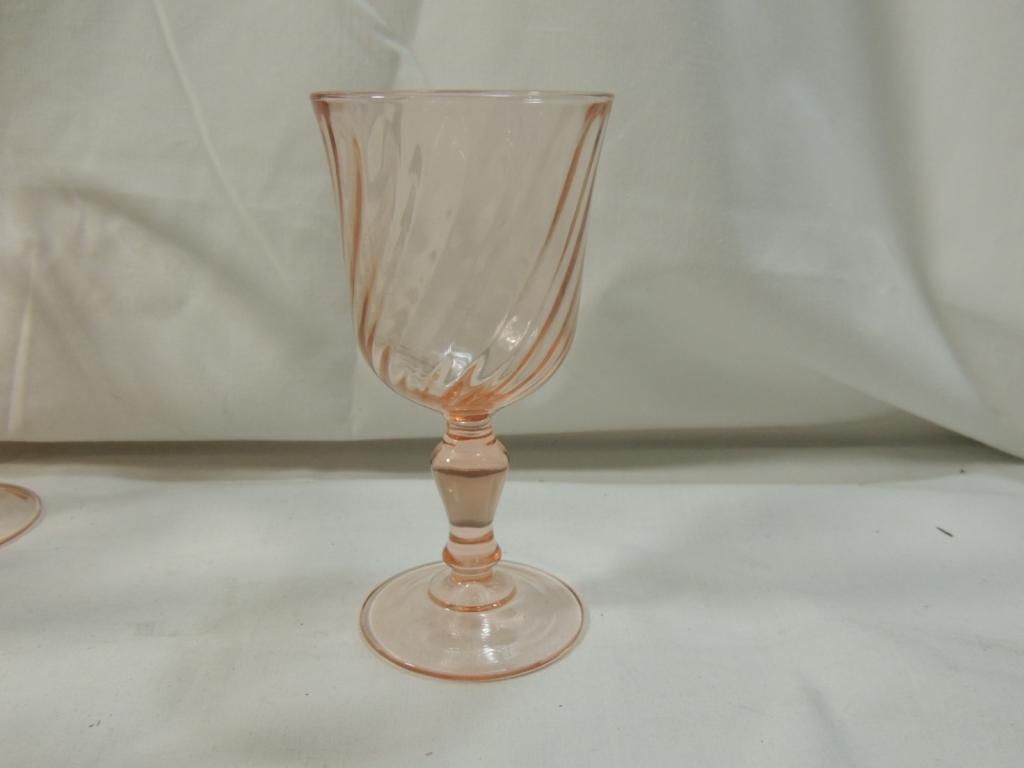 PINK DEPRESSION WINE GLASSES AND SMALL DESSERT WINE GLASSES BRANDY GLASSES. SWIRL PATTERN. BOWL. AS SHOWN. SEE PHOTO FOR MORE DETAILS.