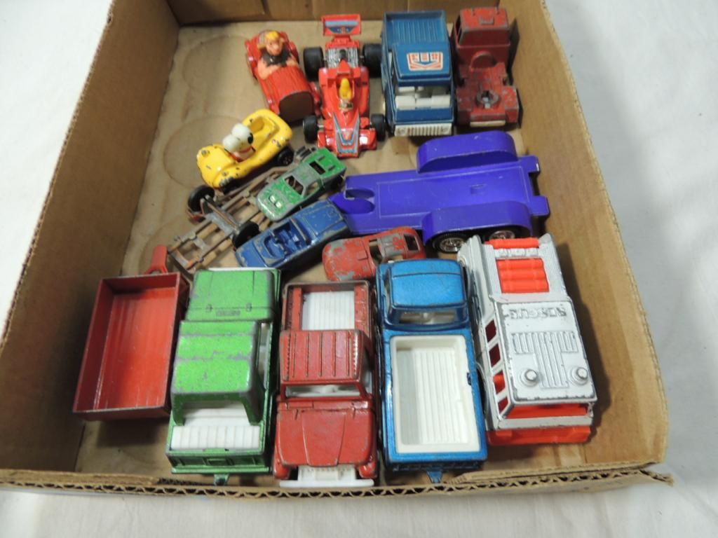 MATCHBOX, DIE CAST TOY CARS. ASSORTED. VINTAGE. METAL, PLASTIC. CARS, TRUCKS, MIXED. RACE CARS, USED, AS SHOWN. SEE PHOTO FOR MORE DETAILS.