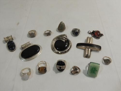 LOT 15 VINTAGE STERLING SILVER JEWELRY, BLACK ONYX, TIGER EYE, MOSS AGATE, RINGS & PINS. AS SHOWN. VIEW PICTURE FOR DETAIL.
