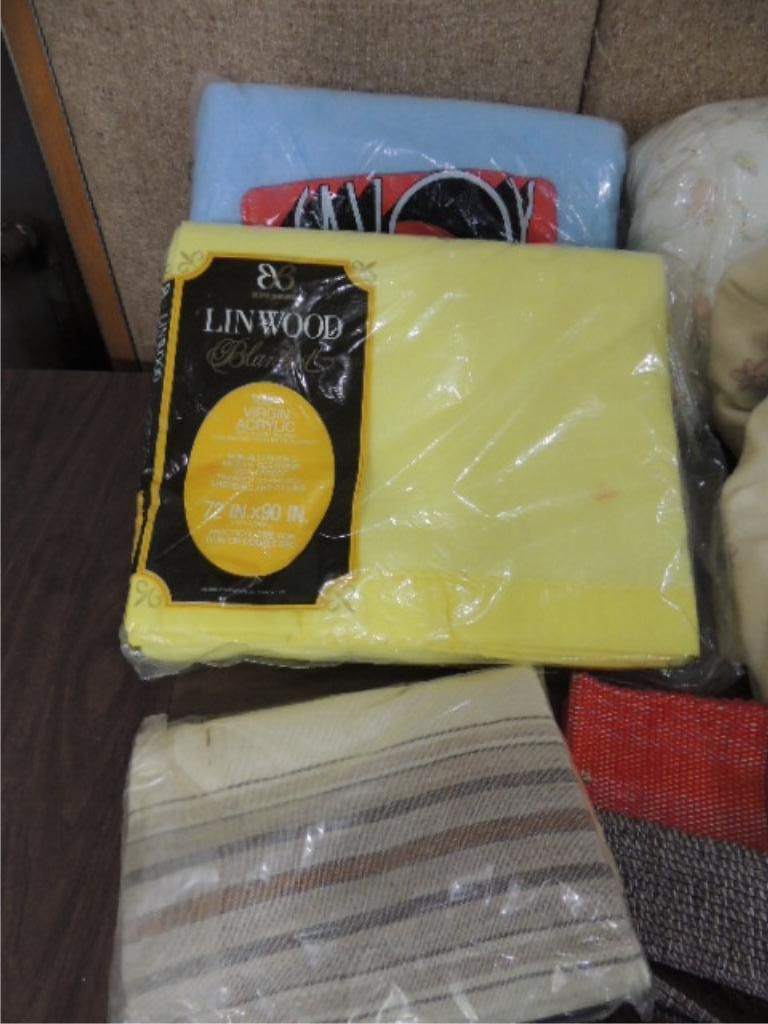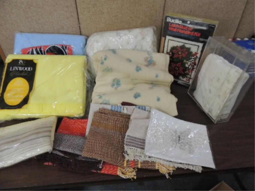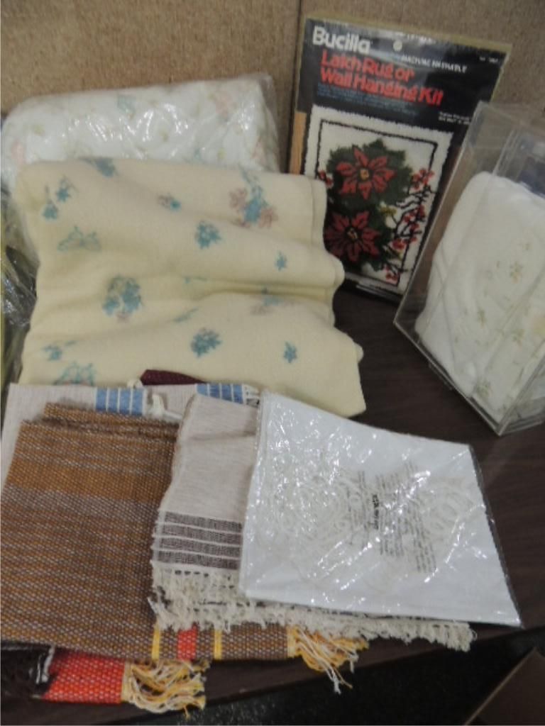 LOT 15 VARIOUS BLANKETS, CRIB COMFORTER, PLACEMATS AND MUCH MORE. MUST NEW IN PACKAGE. AS SHOWN. VIE WPICTURE FOR DETAIL.