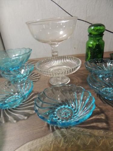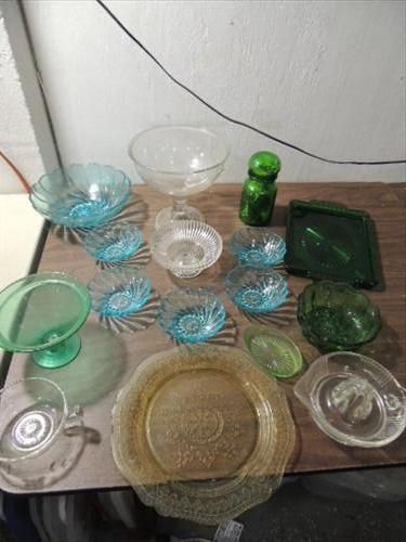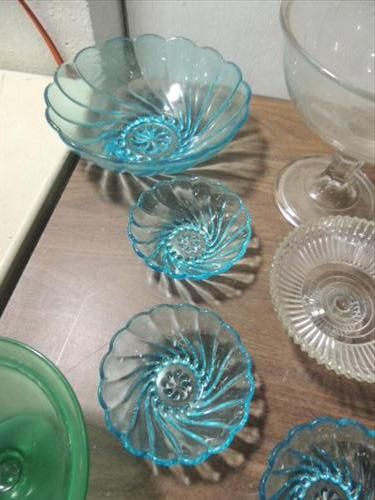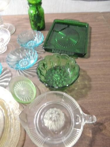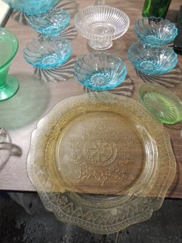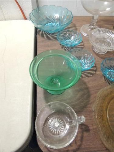 LOT 15 VARIOUS STYLE VINTAGE GLASSWARE: COMPOTES, BOWLS, PLATES, JUICERS AND MORE. GREEN, BLUE, YELLOW & CLEAR GLASSWARE. AS SHOWN. VIEW PICTURE FOR DETAIL.